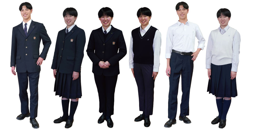 スクールカラーである紫のワンポイントが、ブレザーの左襟やスラックスのポケット、スカートに入ったお洒落なスタイル。高校生のネクタイは落ち着いた雰囲気の青色。ウォッシャブル加工により、家庭での洗濯が可能。撥水加工されているため、雨・水の汚れをはじく。夏服は、男子がワイシャツとスラックス、女子がワイシャツにサマーベストとスカートのシンプルで爽やかなスタイル。女子のベストには、オプションとして紺色もある(冬服時も正装時を除いて着用可)。女子の制服は夏服、冬服用のスラックスも選択できる。