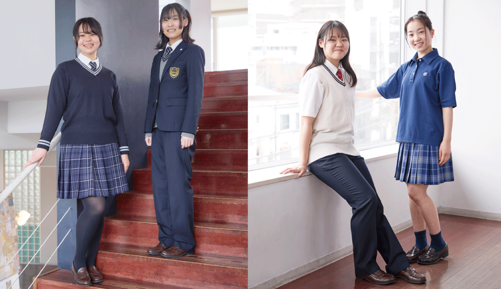 アイテムが多彩で、コーディネートは自由自在。ブレザーは2つボタンのキュートなデザインで、3色のブラウスと2色のセーターで明るく品のある高校生らしさを演出している。夏服も3色の半袖ブラウスと紺と白の2色のポロシャツから選択可能。爽やかなチェックのスカートと白いサマーベストを合わせれば、夏らしい涼しげな装いに。