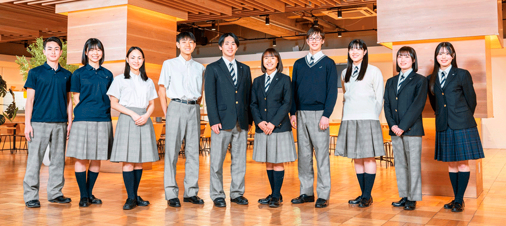 夏服は半袖シャツ(ブラウス)とポロシャツから選べ、冬用のセーターは紺と白の2色を用意。冬服・夏服ともにシャツ(ブラウス)は、ホワイト・ブルー・ピンクの3色がある。通学カバンは、肩掛けのスクールバッグ型またはリュックサック型を好みで選ぶことができる。